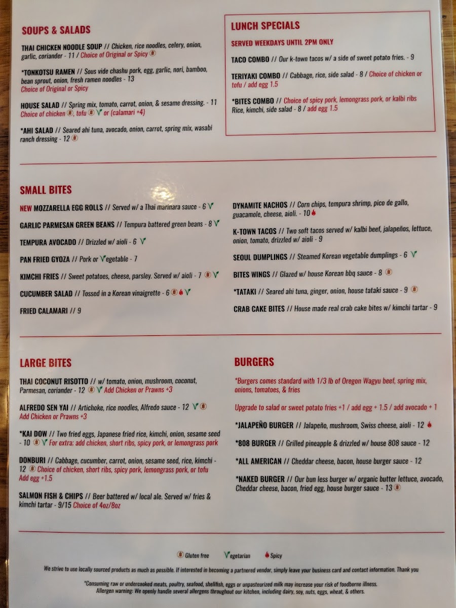 Cabbage, cucumber, carrot, onion, sesame seeds, rice, kimchi / Choice of chicken, short ribs, or spicy pork / Add egg $1.50